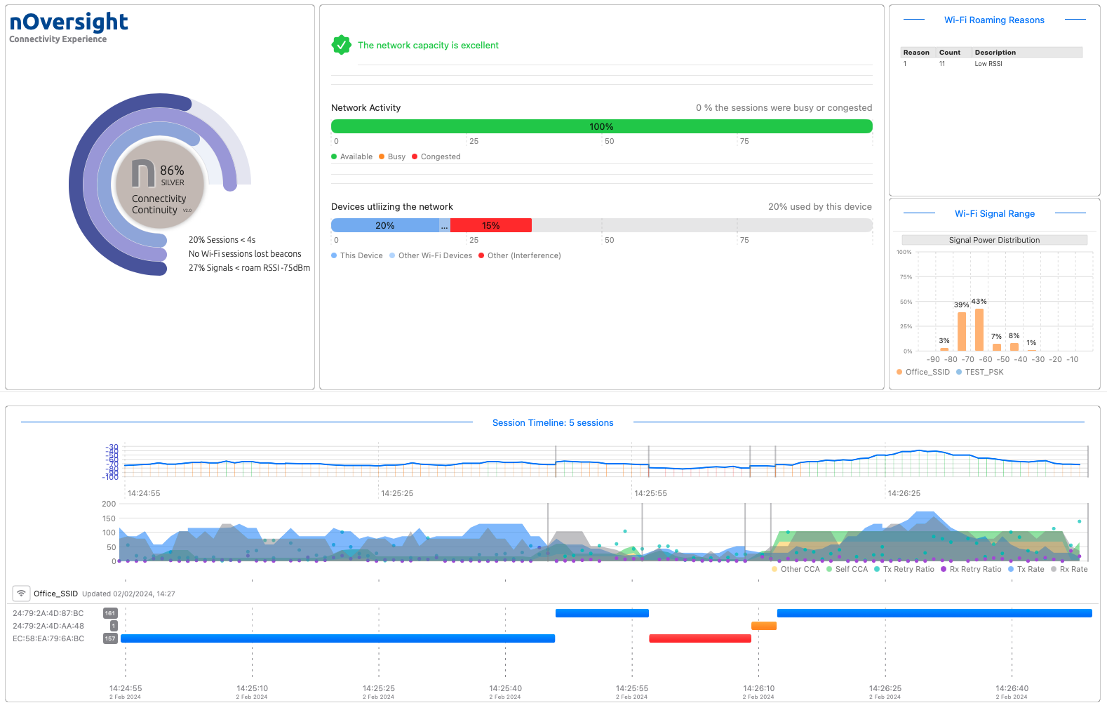 A report is shown which brings together the key outputs we have already explored in the Wi-Fi Analysis section. Now they are together in one grid, focussed on a time of interest and will appear in the PDF if an export is done.